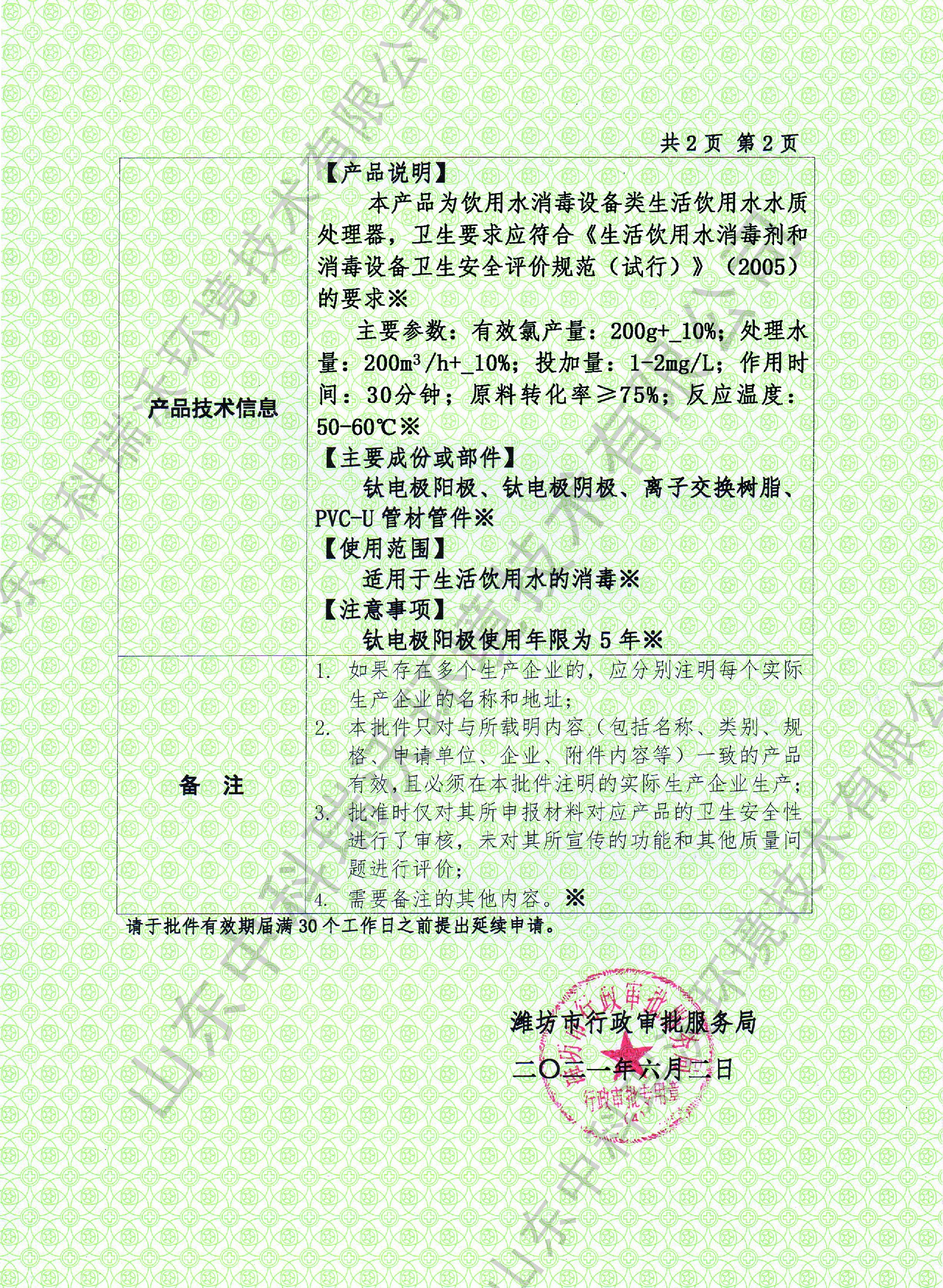 電解次氯酸鈉衛生許可批件
